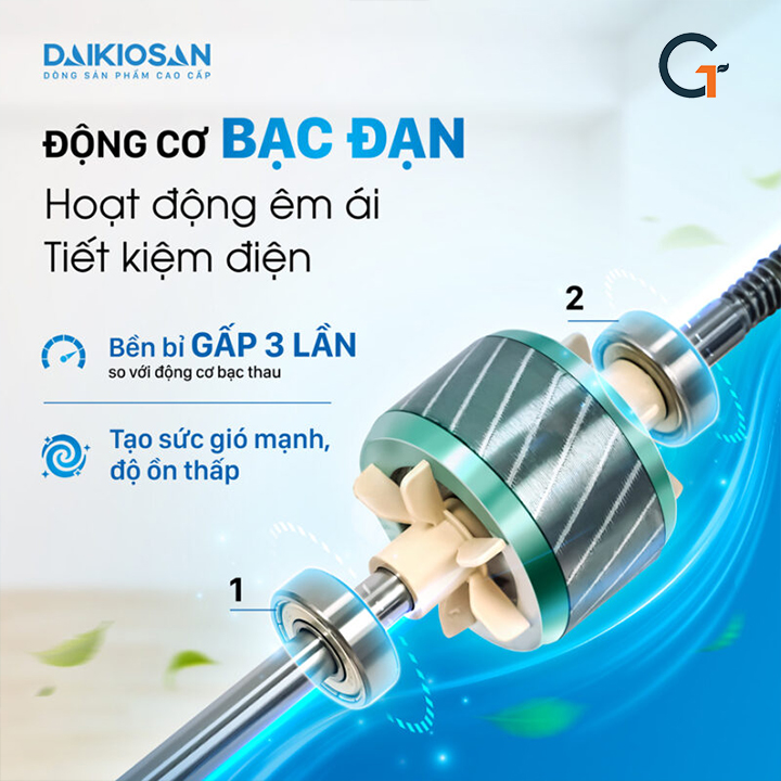 - Daikiosan DQ100 hoạt động với công suất 55W cùng 8 cánh quạt lượn sóng bằng nhựa ABS mang tới tốc độ gió lên đến 1192 vòng/phút.