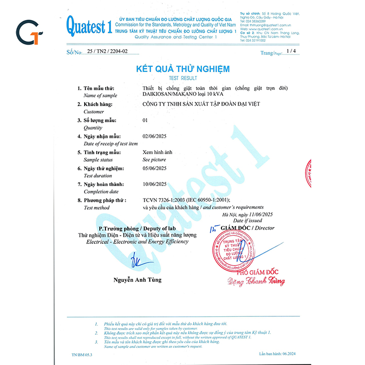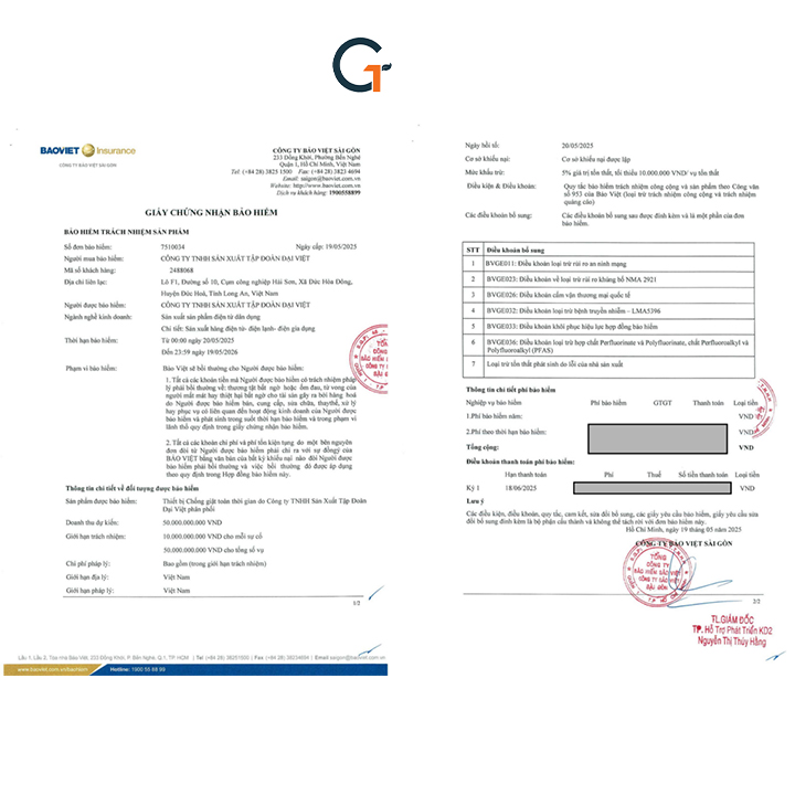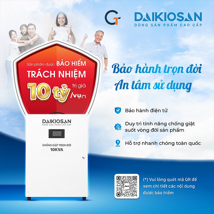 Bảo hiểm trách nhiệm sản phẩm – Giá trị lên đến 10 tỷ đồngKhông chỉ bảo hành, Daikiosan còn mở rộng bảo vệ khách hàng bằng gói bảo hiểm trách nhiệm sản phẩm với giá trị tối đa 10 tỷ đồng cho mỗi sự cố, giúp người dùng hoàn toàn yên tâm khi lắp đặt và sử dụng:Gói bảo hiểm được cung cấp bởi công ty bảo hiểm uy tín, có chứng thư riêng đi kèm mỗi sản phẩm.Áp dụng trong trường hợp thiết bị được lắp đặt đúng kỹ thuật nhưng gây thiệt hại về người hoặc tài sản do lỗi thiết bị.Minh bạch, chuyên nghiệp – giúp tăng độ tin cậy và sự an tâm tuyệt đối cho khách hàng.Chống giật trọn đời Daikiosan 10KVA DE100 1F là sản phẩm vượt trội bậc nhất trên thế giới hiện nay để bảo vệ an toàn sử dụng điện, thiết bị điện trong gia đình.