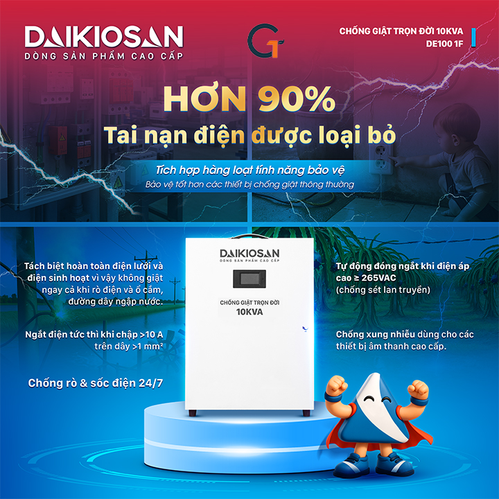 Sản phẩm được nâng cấp với công nghệ chống xung nhiễu, giúp cải thiện chất lượng âm thanh cho dàn karaoke và thiết bị nghe nhạc: giảm rè, âm thanh êm hơn, trầm hơn và trong trẻo hơn. Thiết bị chống giật trọn đời Daikiosan 10KVA DE100 1F còn góp phần kéo dài tuổi thọ cho các thiết bị điện, đặc biệt là các thiết bị điện tử nhạy cảm.Lý do khiến chống giật trọn đời là lựa chọn xứng đáng đầu tư ngay hôm nay1. An toàn cho cả gia đìnhThiết bị chống giật trọn đời Daikiosan 10KVA DE100 1F mang đến mức độ an toàn gần như tuyệt đối cho cả gia đình, từ trẻ nhỏ đến người lớn tuổi. Ngay cả khi trẻ em vô tình chọc vào ổ điện, thiết bị vẫn đảm bảo không gây giật điện dù nguồn điện xoay chiều 220V đang hoạt động.Trong mọi tình huống rò điện tiềm ẩn như bình nóng lạnh bị rò, dây điện bị chuột cắn, mái tôn cọ vào dây dẫn gây hở điện hoặc các thiết bị điện trong nhà gặp sự cố, thiết bị vẫn hoạt động hiệu quả và ngăn chặn nguy cơ giật điện. Dù có hàng triệu khả năng rò điện xảy ra, Daikiosan 10KVA DE100 1F vẫn luôn chủ động bảo vệ bạn và người thân một cách an toàn.Tuy nhiên, trong trường hợp đường dây cũ trong nhà anh chị đã gặp sự cố hỏng hóc hoặc rò rỉ sẵn, thiết bị sẽ đóng vai trò là một "lá chắn giảm chấn" cực kỳ nhạy bén. Thay vì gây ra những cú giật co thắt nguy hiểm tính mạng, anh chị sẽ chỉ cảm thấy tê nhẹ.2. Ngắt điện siêu nhanh, phòng chập cháy do rò điện từ gốcThống kê cho thấy, khi xảy ra sự cố chập điện, dây dẫn có thể bắt đầu bốc cháy chỉ sau 3 đến 7 giây. Tuy nhiên, thiết bị chống giật trọn đời Daikiosan 10KVA DE100 1F có khả năng ngắt điện chỉ trong 0,1 - 0,4 giây — nhanh hơn cả thời gian ngọn lửa kịp bén. Nhờ đó, nguy cơ chập cháy được giảm thiểu tối đa, giúp bảo vệ an toàn cho tính mạng và tài sản của bạn.3. Tiết kiệm chi phí đầu tư và vận hànhThay vì phải lắp đặt tới 8 thiết bị an toàn điện riêng lẻ như CB chống giật RCBO, thiết bị chống sét lan truyền, biến áp cách ly, bộ đổi nguồn, đồng hồ đo điện áp, thiết bị chống nhiễu, chống quá tải..., giải pháp này giúp tinh gọn toàn bộ hệ thống. Không chỉ tối ưu không gian lắp đặt, mà còn tiết kiệm chi phí đầu tư từ vài chục đến cả trăm triệu đồng, tùy theo thương hiệu và xuất xứ của từng thiết bị nếu mua riêng lẻ.4. Bảo vệ thiết bị điện – Tăng tuổi thọ gấp nhiều lầnNhờ khả năng ổn định nguồn điện, lọc nhiễu và loại bỏ xung điện, toàn bộ thiết bị điện trong nhà bạn từ TV, tủ lạnh, máy giặt, bếp từ, máy lọc nước đến các thiết bị nhạy như wifi, camera hay máy tính đều vận hành ổn định, êm ái và ít gặp sự cố hơn. Thiết bị chống giật trọn đời Daikiosan 10KVA DE100 1F còn giúp giảm thiểu hiện tượng sốc điện và dao động điện áp lớn, từ đó hạn chế hao mòn linh kiện và kéo dài tuổi thọ thiết bị một cách đáng kể.5. Chống sét lan truyền – bảo vệ tài sản điện trước nguy cơ "bốc hơi" chỉ trong tích tắcSét lan truyền là một trong những nguyên nhân hàng đầu gây hỏng hóc thiết bị điện. Khi điện áp bất ngờ vượt ngưỡng 265V chỉ trong chớp mắt, các thiết bị như TV, tủ lạnh, điều hòa... có thể bị phá hủy ngay lập tức. Thiết bị chống giật trọn đời Daikiosan 10KVA DE100 1F sẽ ngay lập tức ngắt điện tại đầu nguồn khi phát hiện dòng sét lan truyền, giúp bảo vệ toàn bộ hệ thống điện trong nhà bạn một cách an toàn tuyệt đối.6. Trải nghiệm giải trí nâng cấp – âm thanh, hình ảnh “đã” hơnNhờ tính năng lọc xung nhiễu và ổn định nguồn điện, các thiết bị giải trí trong nhà như dàn karaoke, âm thanh, thiết bị hình ảnh… hoạt động với hiệu suất tối ưu hơn. Âm thanh trong trẻo, hình ảnh sắc nét, và ít bị gián đoạn do nhiễu điện. Từ đó nâng cao trải nghiệm giải trí của cả gia đình.